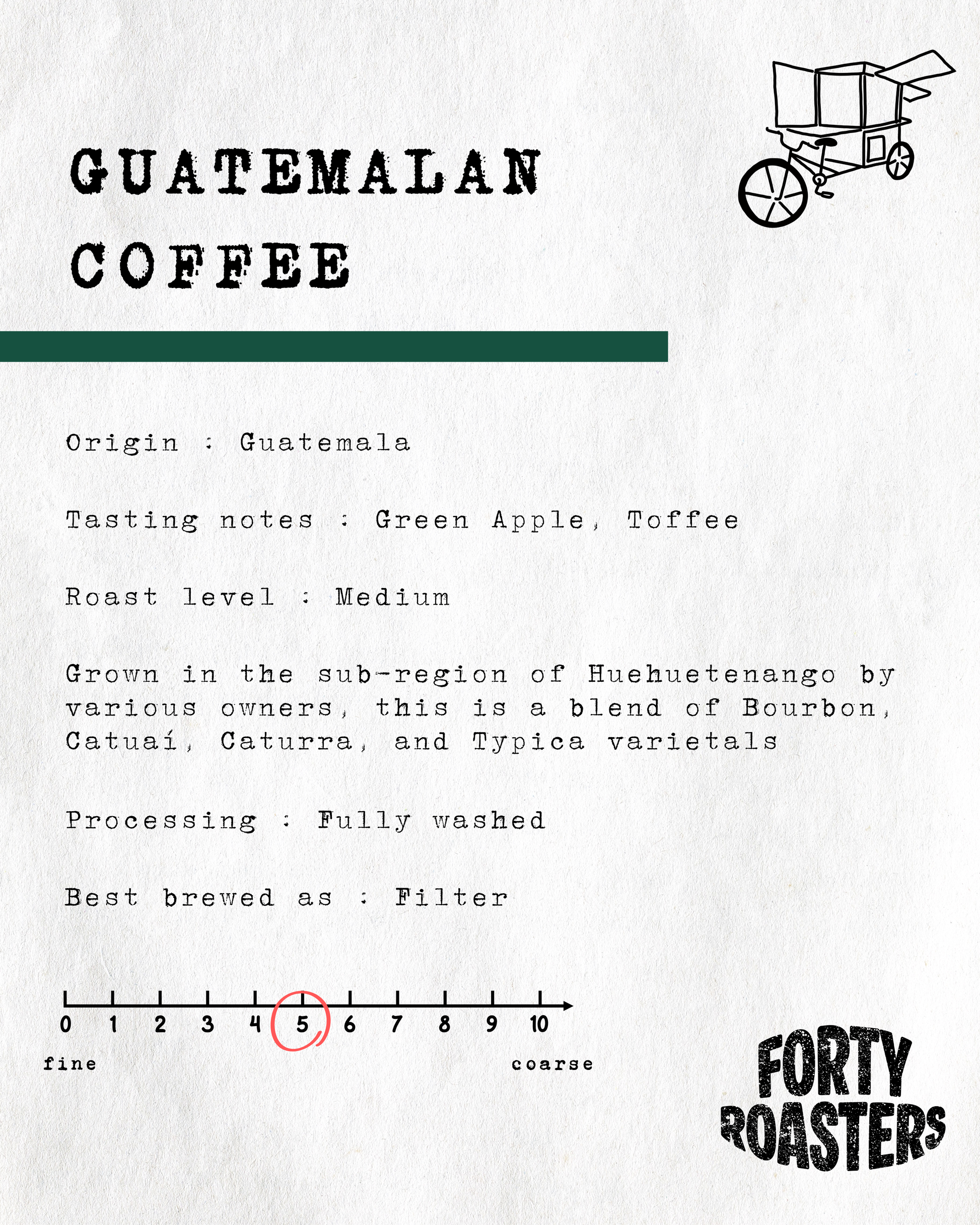 This beautiful Guatemalan coffee has tasting notes of Green Apple and Toffee.